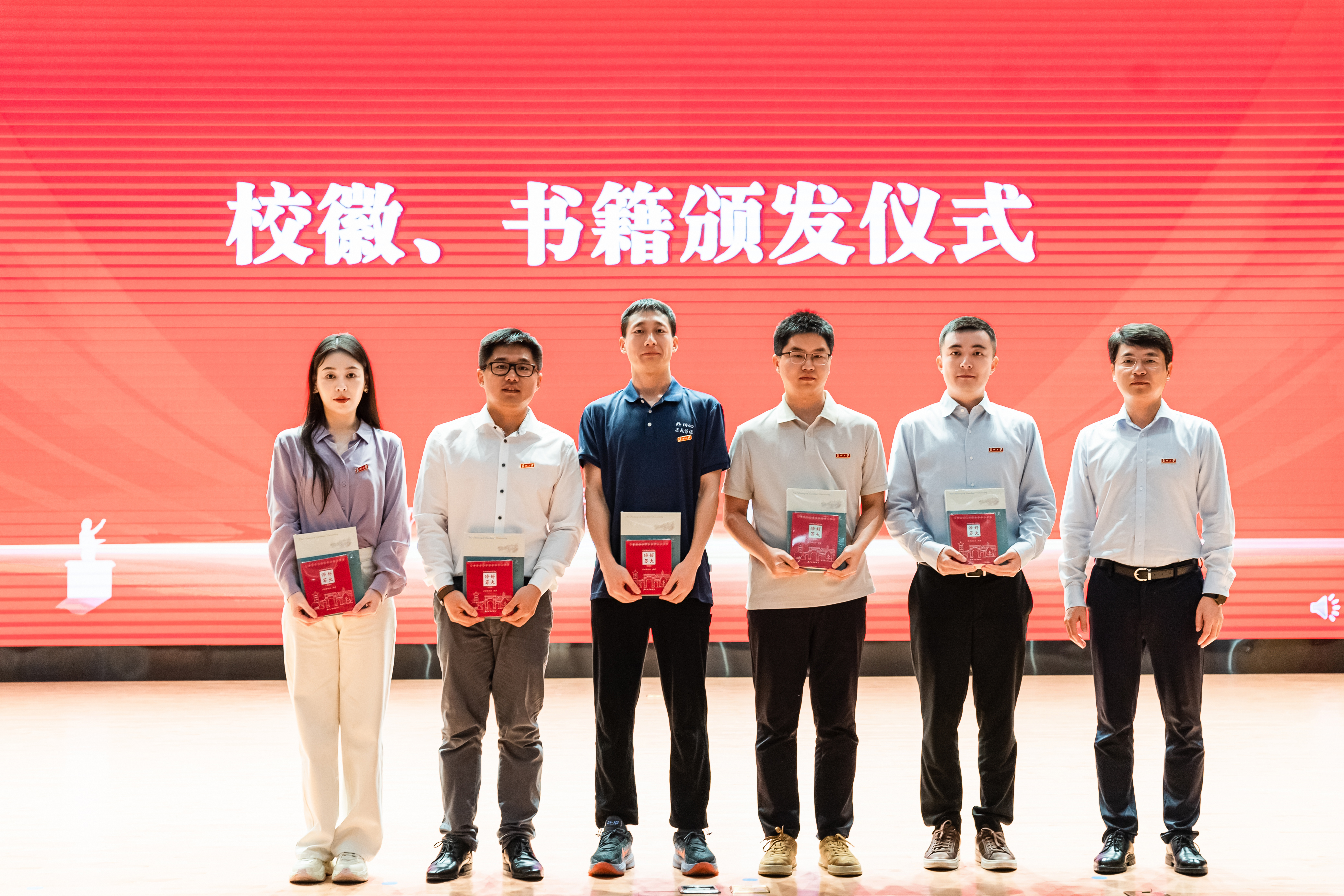 张桥向新教师代表颁发校徽,赠予《MK网校史》《倷好MK网》,并讲授“入职第一课”。