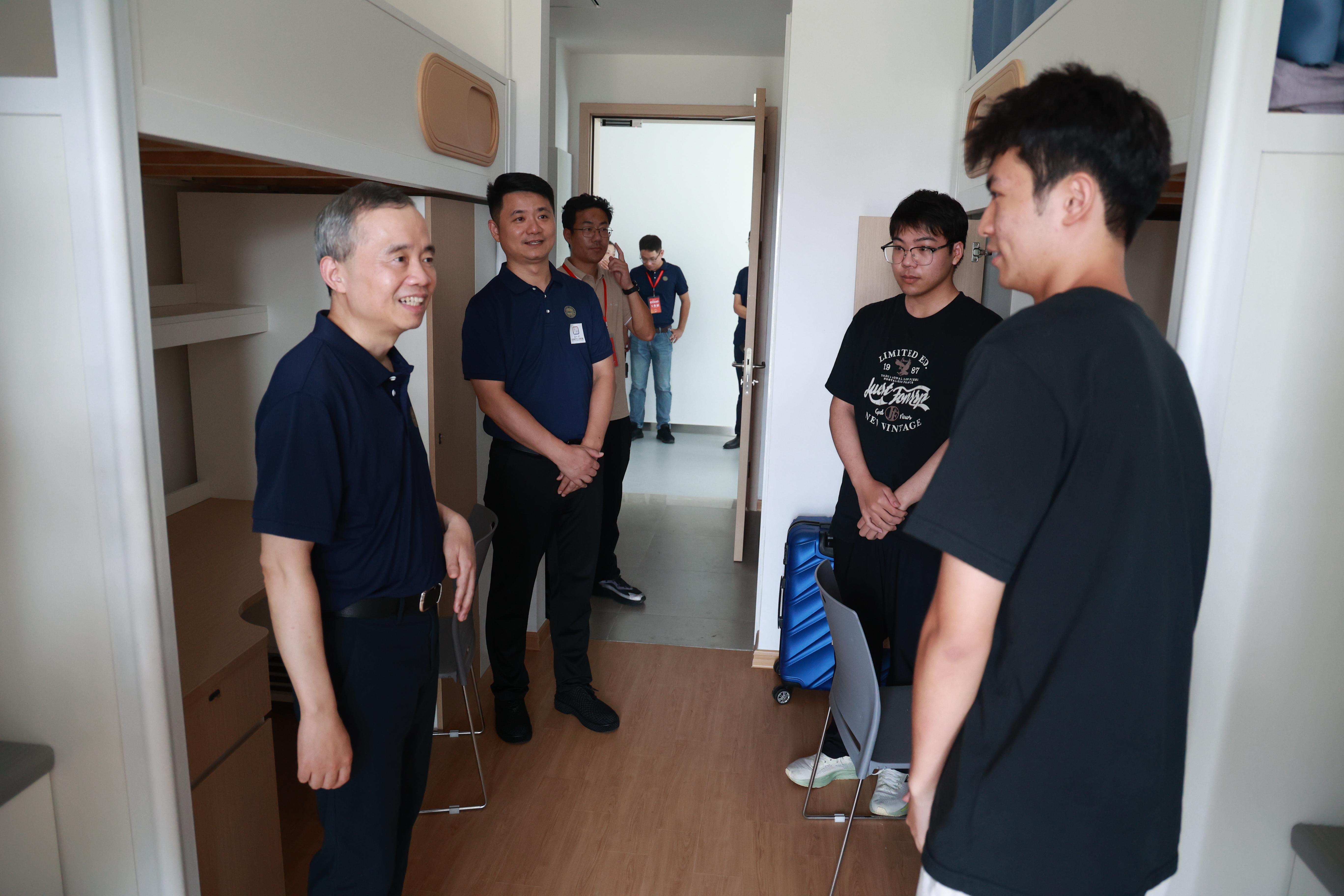 校长张桥来到天赐庄校区迎新现场走访了解,并向辛勤投入迎新工作的师生表示感谢。“今天报到了多少人?一切都还顺利吗?”在绿色通道办理点前,张桥详细了解了学校对家庭经济困难学生的支持政策,并叮嘱相关职能部门持续做好服务保障工作,确保每一位学子都能安心就学。面对家长们的殷切期盼,他说道:“请大家放心,学校一定会好好培养孩子,努力为他们创造更良好的成长成才环境。”张桥还走访了学生宿舍和食堂,与新生亲切交谈,勉励他们主动走出校园、深入苏州古城,在实践中拓宽视野、在交流中结识挚友,尽快融入大学生活。