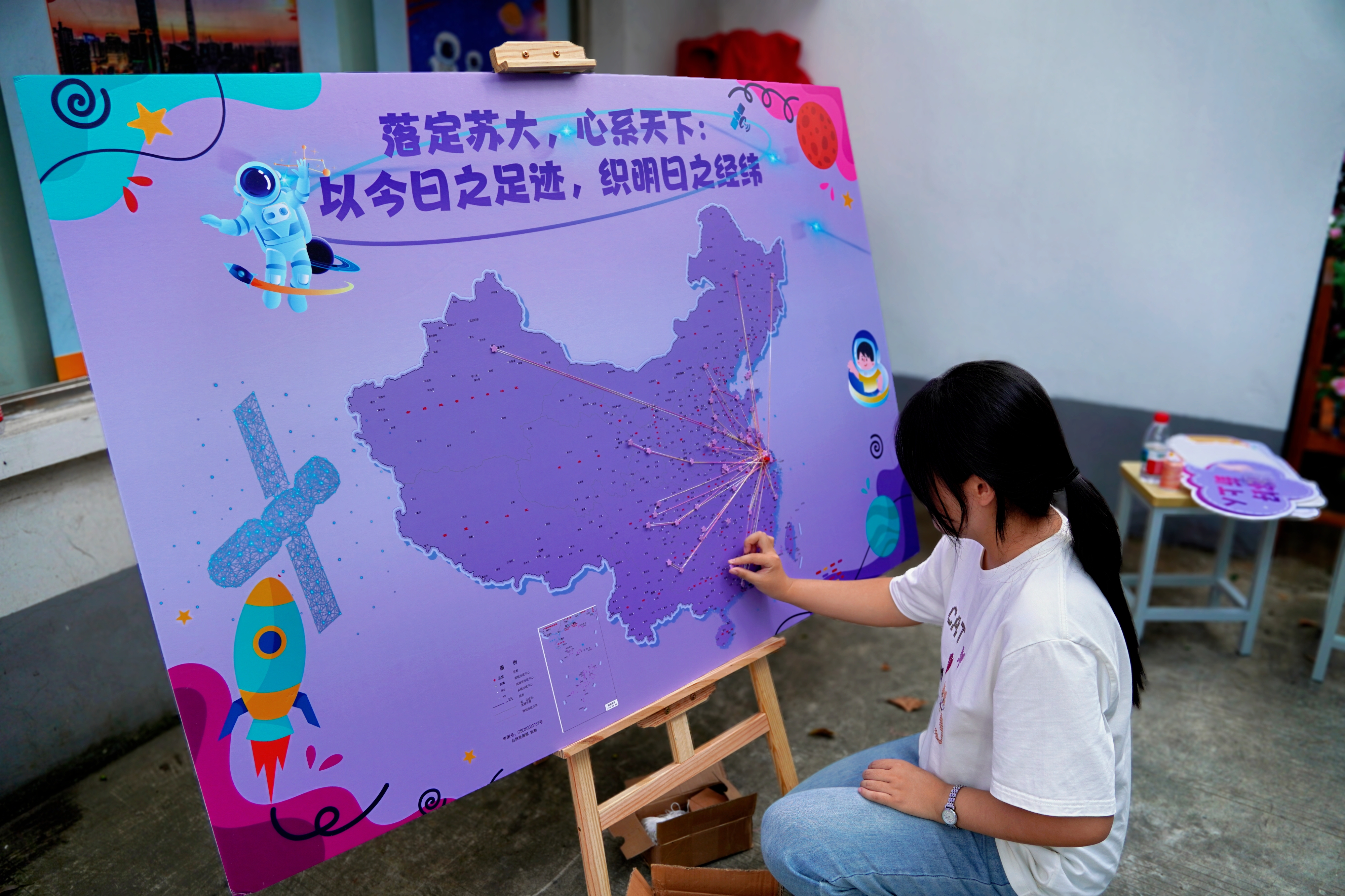 纺织与服装工程学院准备了温暖又亮眼的“打卡点”。在“家乡印记”互动墙处,新生们可以将一颗颗五角星钉在自己家乡的位置,既是温暖的仪式,也是无声的共鸣。
