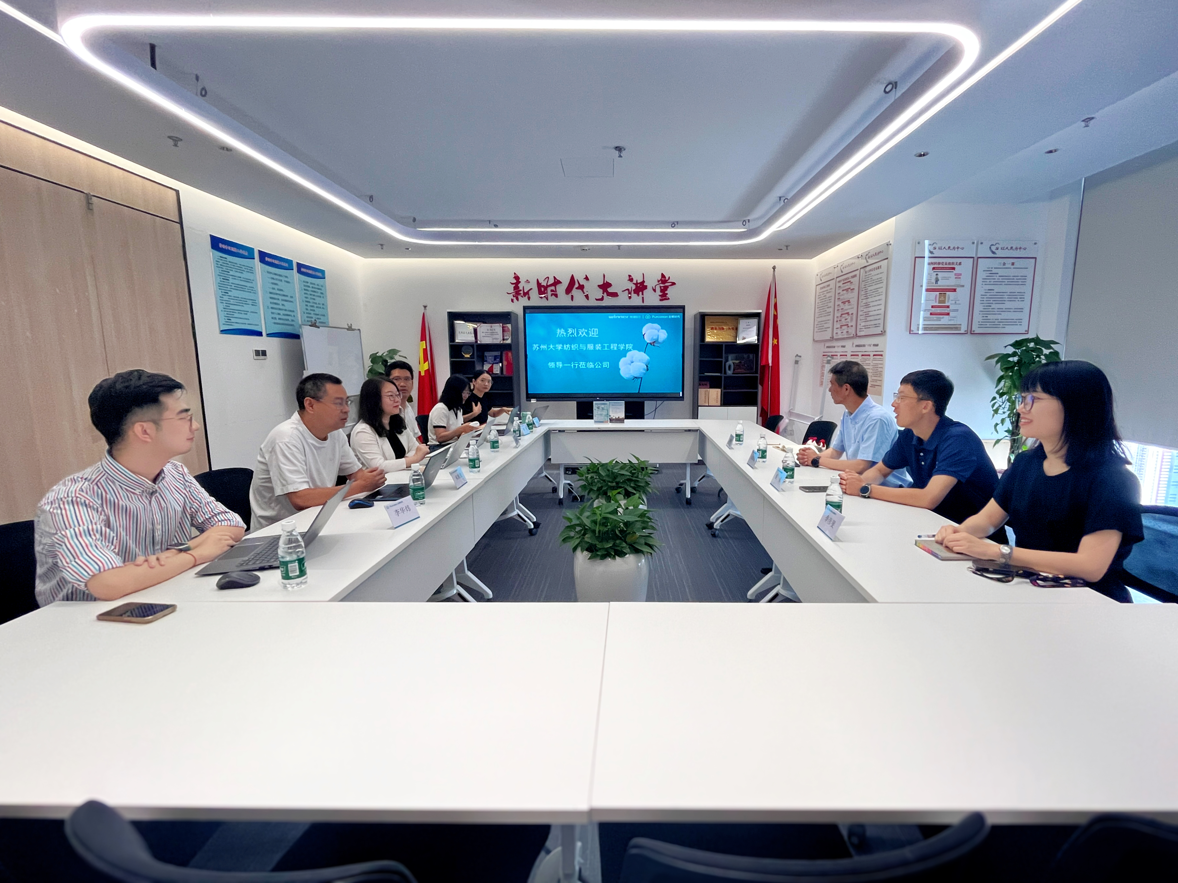 在全棉时代,双方围绕纺织服装行业的创新发展、人才培养模式展开深入交流。在企业负责人的陪同下,学校一行参观了全棉时代品牌展厅和旗舰店,深入了解了企业的发展历程、业务布局及品牌定位,直观感受了全棉时代的产品研发实力与创新设计能力。