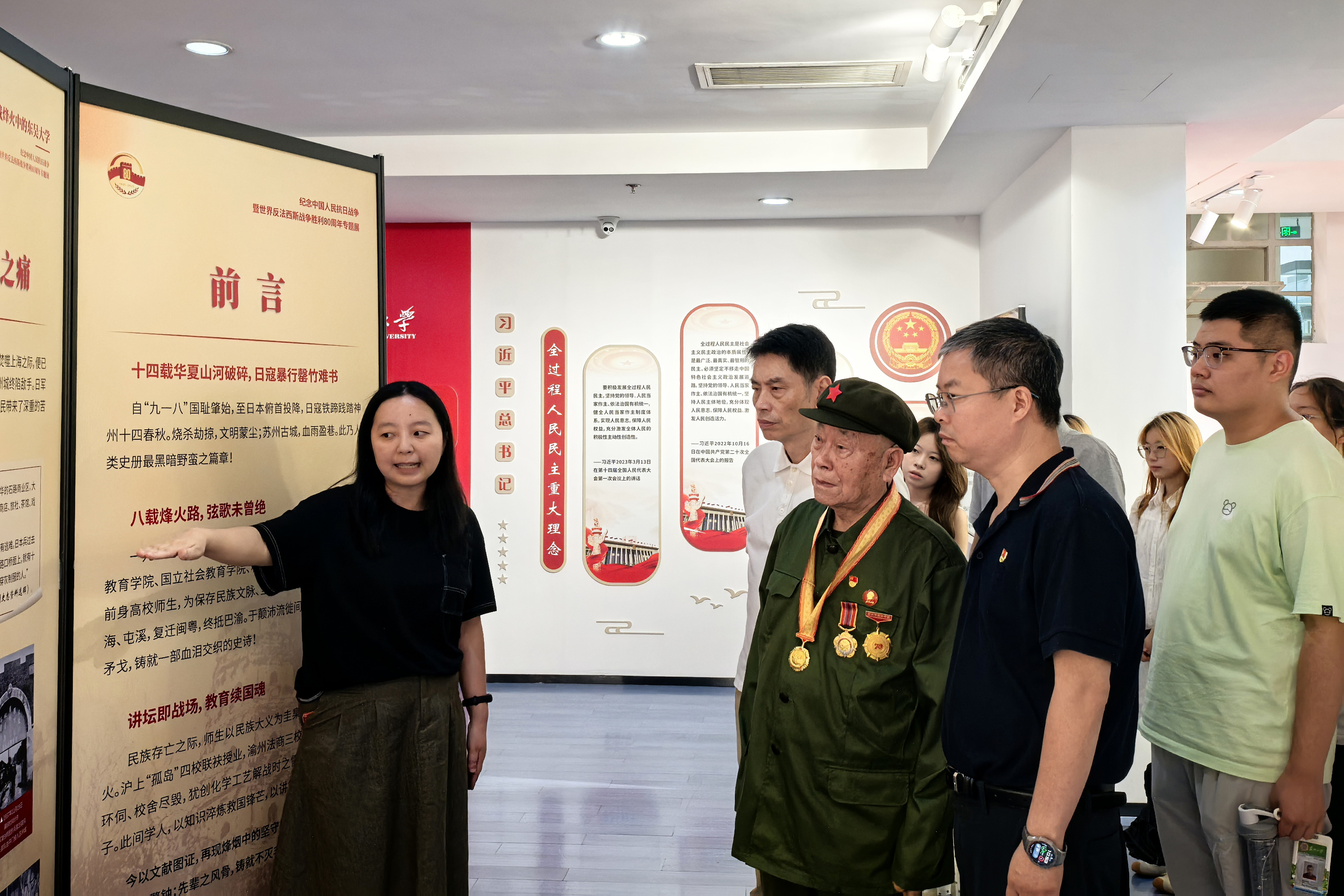 展览开展一周,已吸引了20余批不同单位的师生参观,其中有97岁抗战老兵任志校友和纺织与服装工程学院的团队参观,护理学院研究生陈同学感言:“烽烟虽已散去,抗战精神却生生不息。新时代青年当珍惜和平,传承爱国与奋斗精神,将个人理想融入国家大局,为现代化建设贡献青春力量。”